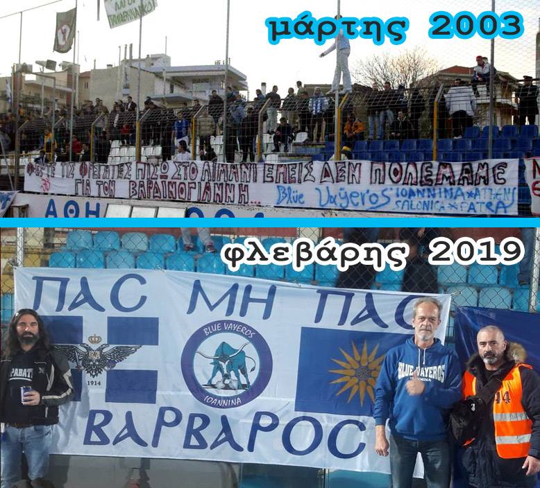 Το μακρινό 2003, με την έναρξη του 2ου πολέμου στο Ιράκ, ο σύνδεσμος Blue Vayeros αποφάσισε ορθότατα να τοποθετηθεί ενάντια σε έναν πόλεμο που διεξαγόταν χιλιάδες χιλιόμετρα μακριά με το οξυδερκές πανό «Φέρτε τις φρεγάτες πίσω στο λιμάνι, ΕΜΕΙΣ δεν πολεμάμε για το Βαρδινογιάννη». Έκτοτε η αρχική σύνθεση των Blue Vayeros έχει αλλάξει τραγικά. Αυτή η υγιής παρέα αλανιών που έφερε τον οπαδισμό στα Γιάννινα στα μέσα της δεκαετίας του ’90, κυνηγήθηκε, συκοφαντήθηκε και εκδιώχθηκε μέχρι να αναδυθούν στη θέση τους ψυχροί δολοπλόκοι, τυχοδιώκτες και συμφεροντολόγοι, οι οποίοι μετέτρεψαν το σύνδεσμο σε ένα επικερδές παραμάγαζο της διοίκησης.